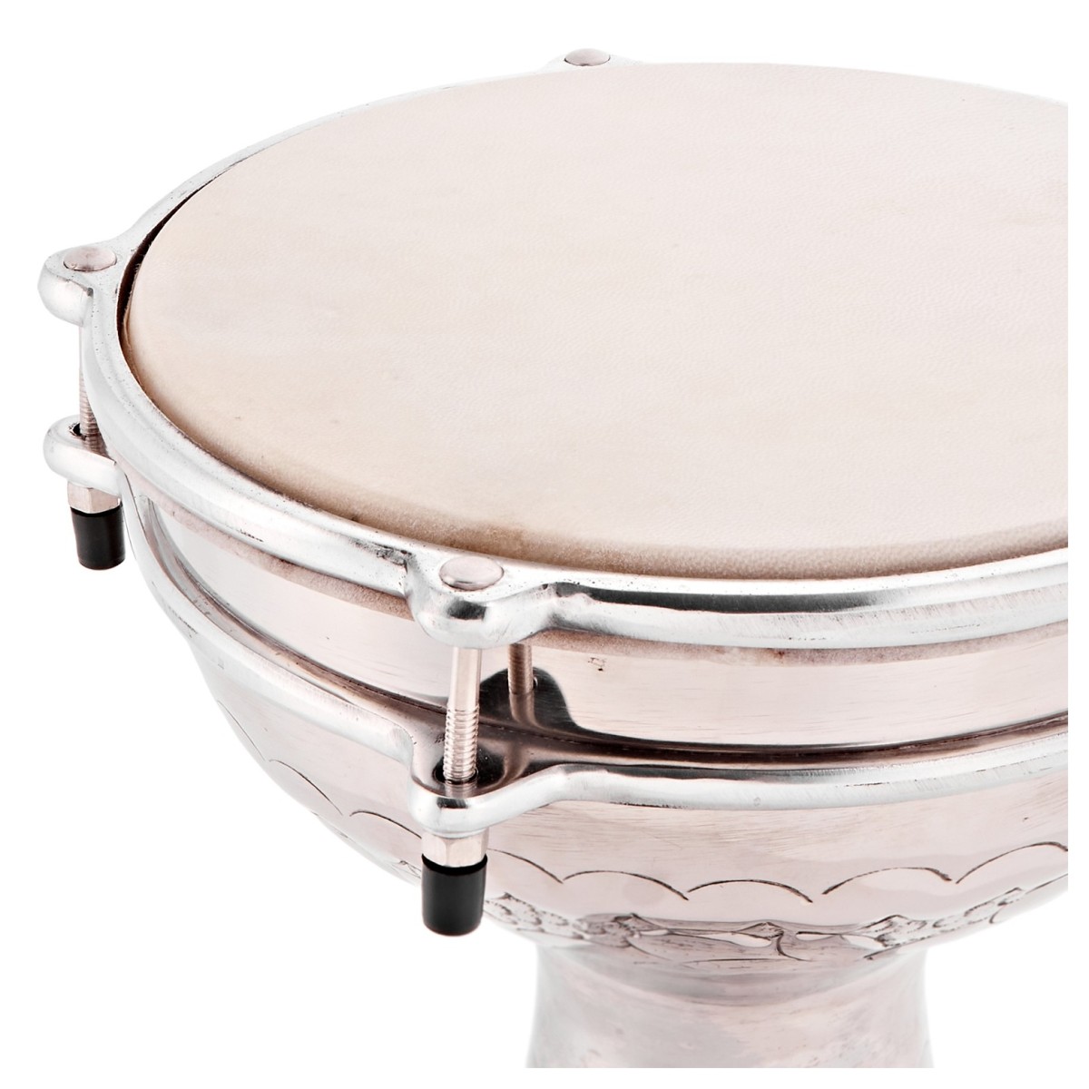 A great quality hand hammered Turkish style Darbuka. With an embossed patterned body, tuneable goat skin head and aluminium rim with five tuning lugs the aluminium Darbuka by Gear4music offers an authentic instrument at an affordable price.